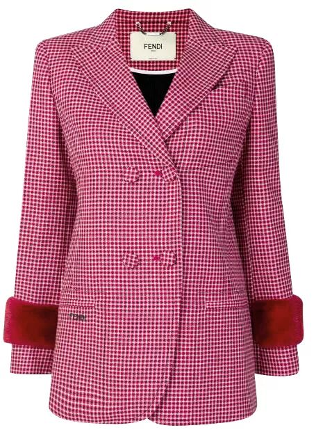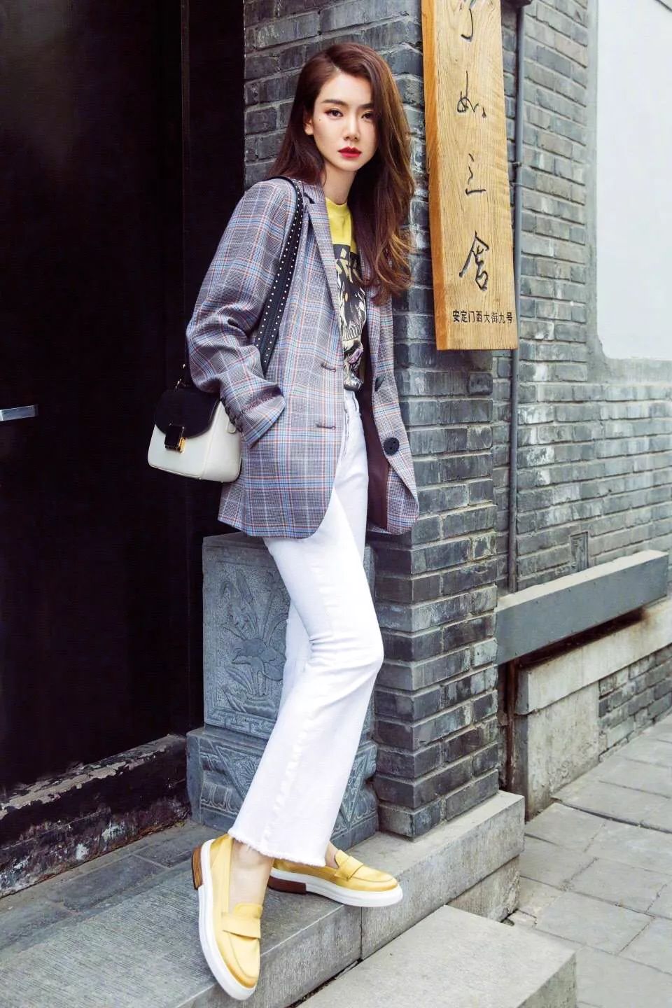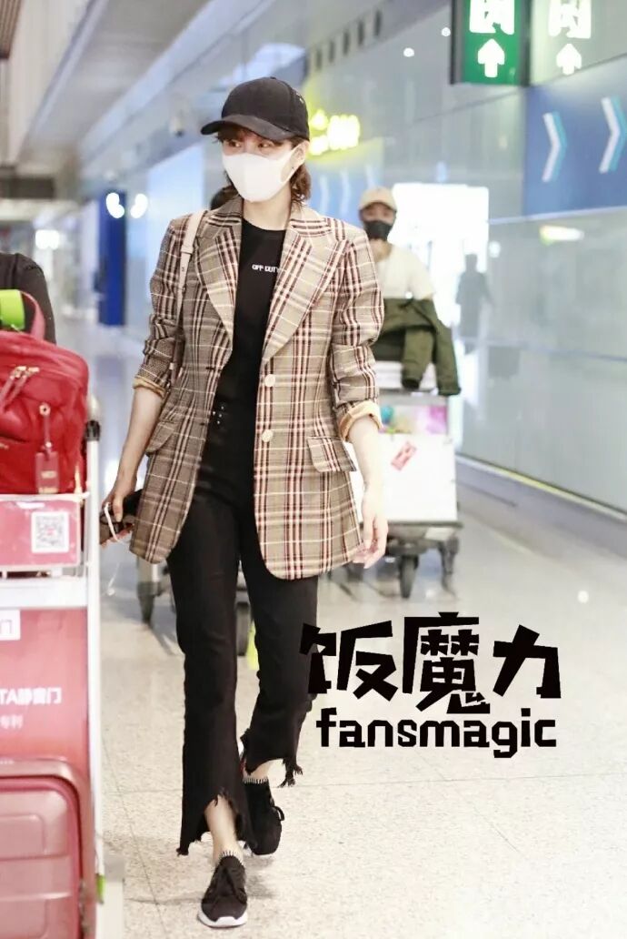 刘诗诗用复古格纹西装搭配黑色T恤和牛仔裤是保守穿法,这件西装是Gucci 的,价格¥23500.