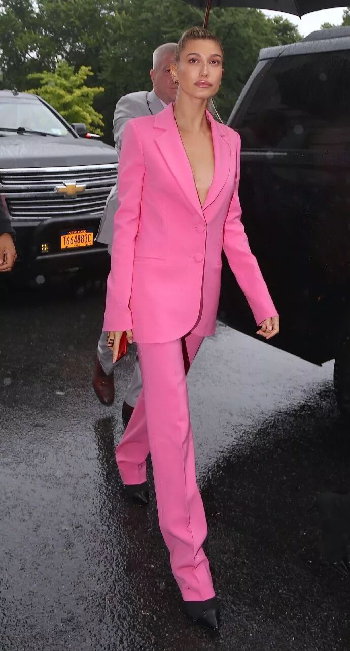 Hailey Baldwin一向是时髦穿搭的风向标,订了婚之后的她感觉连穿搭都多了女人味,这套粉色西服套装光是靠颜色就能轻松取胜,这套来自Carolina Herrera 西装夹克价格约¥15495 .裤子¥7715.