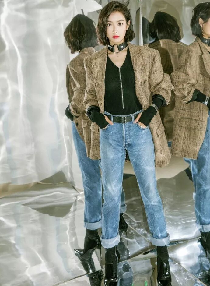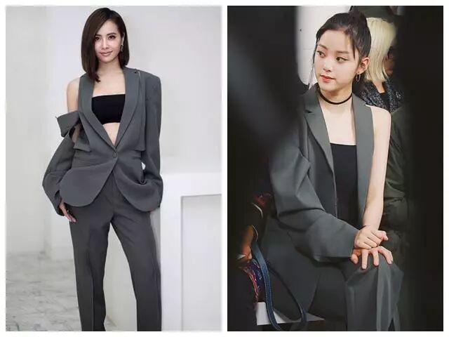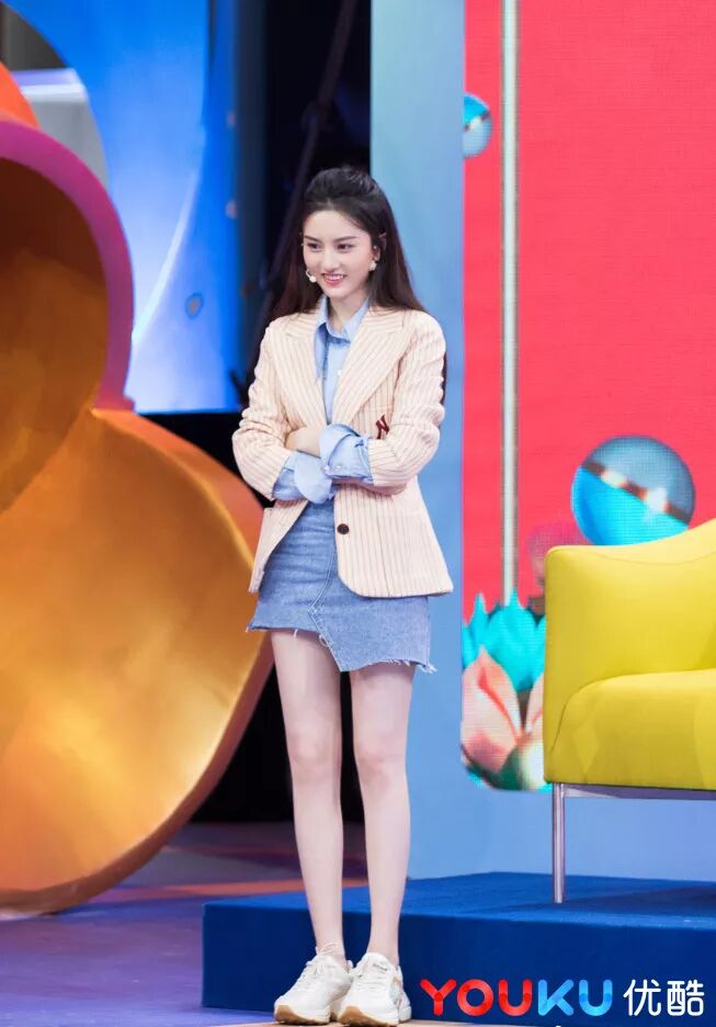 这件复古条纹西装还撞衫了宋祖儿,祖儿搭配牛仔短裙和一双运动鞋,少女感十足。
