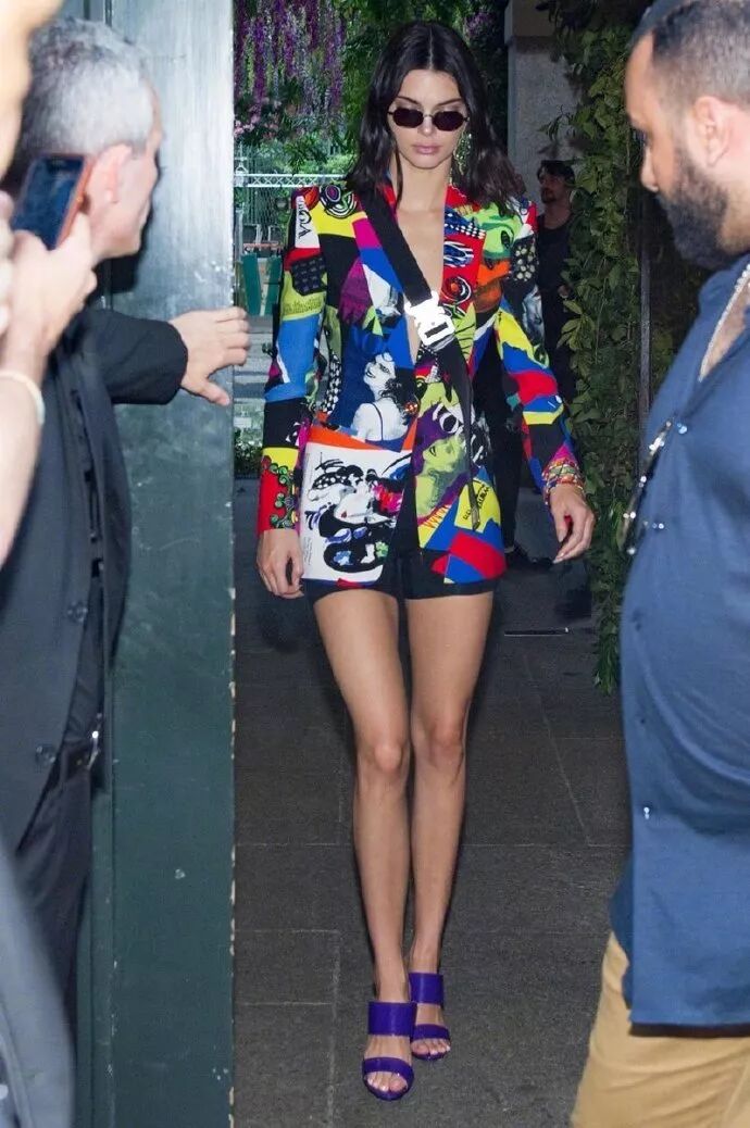 Kendall Jenner同样用亮彩色西装拗造型,高跟鞋与西装撞色的恰到好处,造型不乏味。这件西装来自Versace,价格约合¥26900,脚踩的高跟凉鞋也是Versace,价格约合¥6800.
