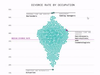 又到了父母催婚的季节,不用慌,圈内知名博主Nathan Yau(《鲜活的数据:数据可视化指南》作者)为大家准备好了应对方案。在收集了美国500多种职场人的数据之后,Nathan发现游戏经理人和调酒师离婚率最高,超过50%,精算师离婚率最低,在15%左右。从事交通运输行业的人们,汽车司机和空姐的离婚率最高,建筑师和工程师的离婚率最低。工资和离婚率虽然没有必然的因果关系,但数据推算:工资越高、离婚率越低。作为“职业婚恋”博主,Nathan还制作了一篇《Occupation Matchmaker (职场人婚恋匹配指南)》帮助大家锁定重点目标。