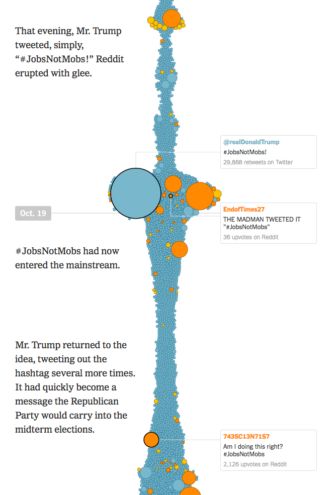 这个看上去逼死密恐症患者的作品来自纽约时报,Jobs not Mobs(要工作不要暴民)是美国中期选举时期的一句流行语,不到两周时间,这句洗脑的口号就从共和党支持者内部蔓延到全网。纽约时报用时间轴的方式整理了整个社交舆论的发酵过程,每个点都代表每位用户的意见,圆点的大小表示影响力的大小。图中特朗普的推特获得了近三万多的转发,不愧是推特达人。