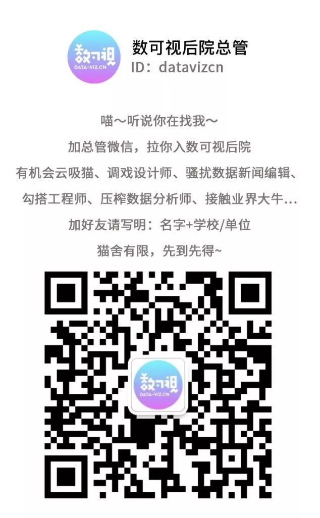 2019年,数可视也将举办一系列沙龙、培训、线下聚会,欢迎各位同学前来吸猫。同时,欢迎大家添加“数可视猫咪后院”总管微信,可撩可骚扰。