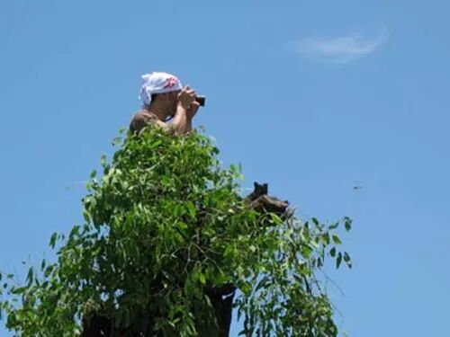 令他印象深刻的是有一次,他为了拍摄爬到树上,结果要下来的时候,往下一看却傻眼了。