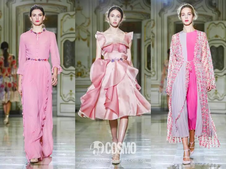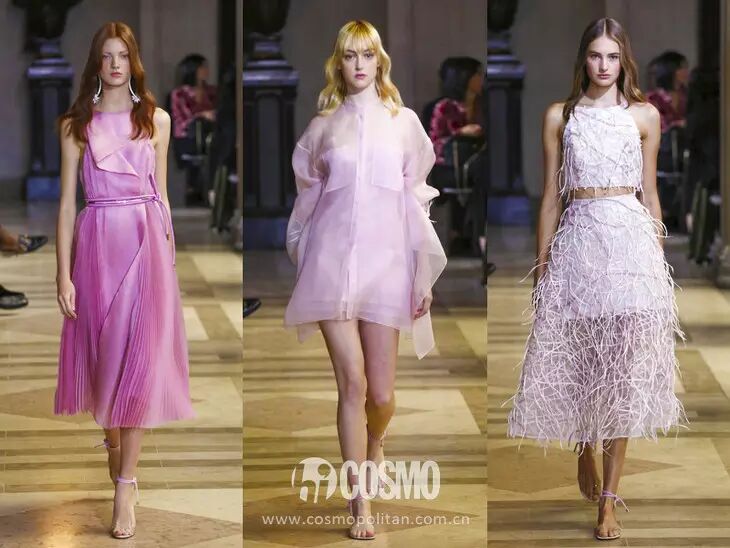 再看纽约的Carolina Herrera秀场上,设计师依旧选用轻薄飘逸的材质来演绎粉色造型,让甜美的粉色更显通透,多了几分仙气。