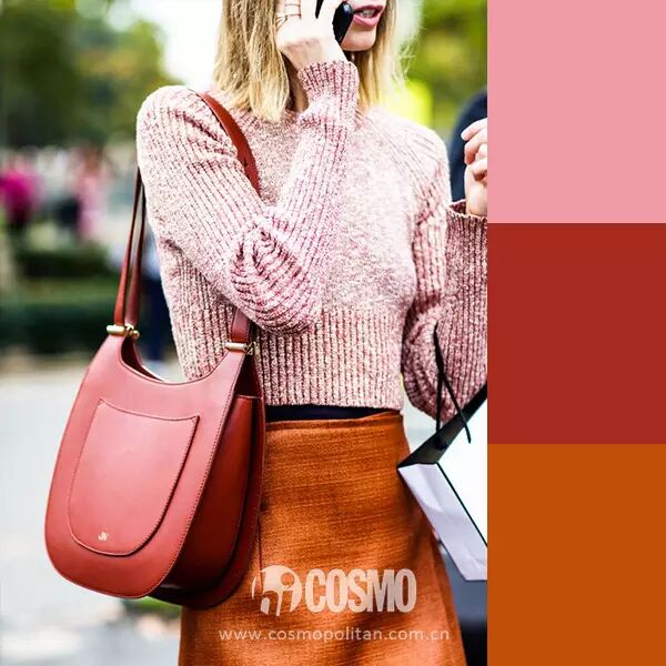 在红色与橙色的搭配中加入浅粉色,其实等同于在一组同色系的双色搭配中加入另外一种颜色,这样的三色搭配从思路上讲其实和上面一样,也可以简化为双色的搭配。