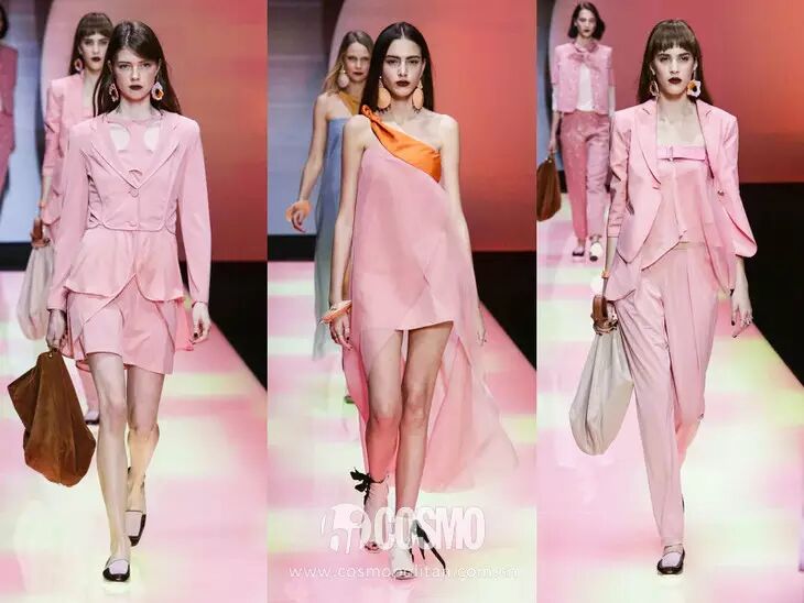 Emporio Armani秀场上的粉色造型大多采用轻盈的面料,避免这些粉色Look陷入甜腻的“诅咒”。或丰富的细节,让粉色如初见那样浪漫美好;或极简的线条,让粉色也转型玩起利落和干练Feel。Emporio Armani似乎就是要证明,粉色绝不是小公主的专利。