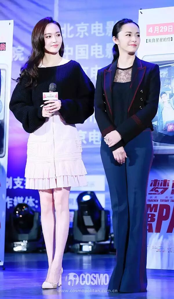 最近,唐嫣在宣传新电影《梦想合伙人》时,选择了一件浅粉色的荷叶褶短裙搭配黑色荷叶边短款针织衫,清爽中透着伶俐,把粉色穿得脱俗极了。