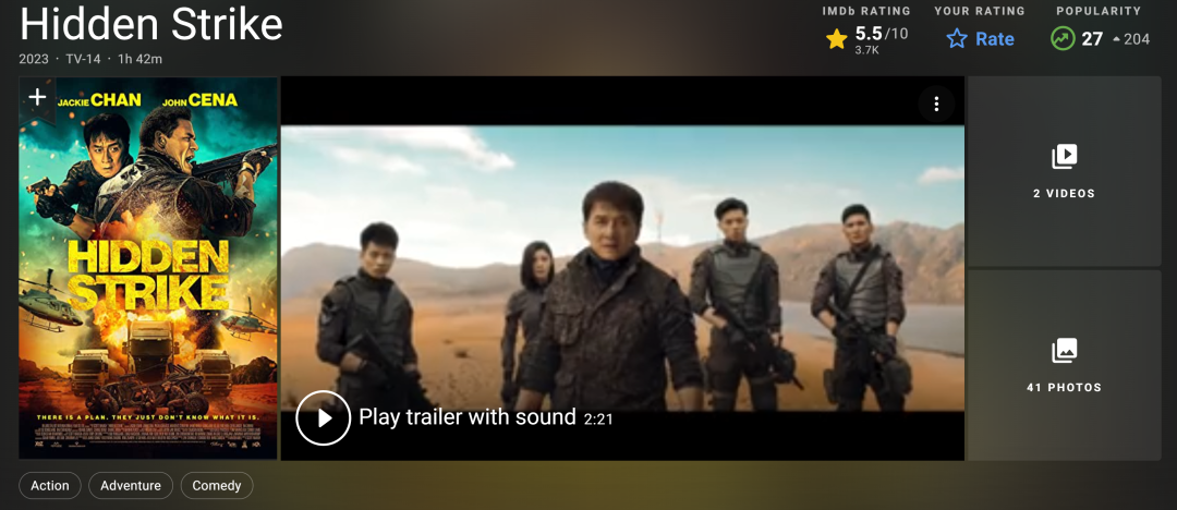 2018年拍摄,对标《战狼2》的军事动作题材,据说超过8000万美元的投资,全套好莱坞班底,还一度传出邀请史泰龙和成龙生涯首度演对手戏。