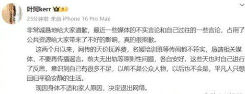 2024年,叶柯宣布退网。