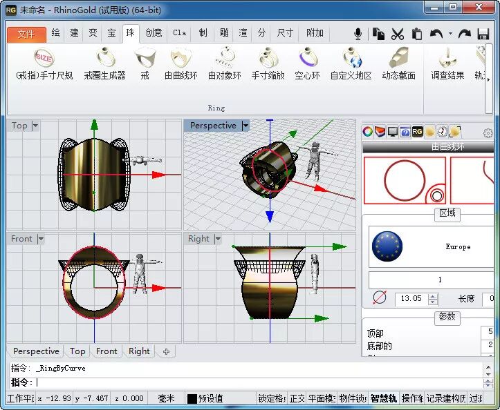 RhinoGold是前面提到的Rhino软件的珠宝专业插件,但拥有独立的操作界面,如果熟悉Rhino软件的人,使用RhinoGold将得心应手。这款软件的宗旨是“用最好最先进的工具来创建订制珠宝首饰,简单的元素结合在一起,使RhinoGold成为最适合珠宝专业人士的利器”。