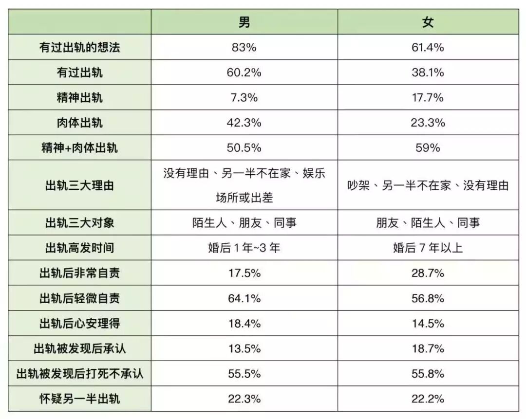 这些数据很有意思,在出轨方面男女的理由和对象出奇的一致,而在出轨态度的这个方面却截然不同。