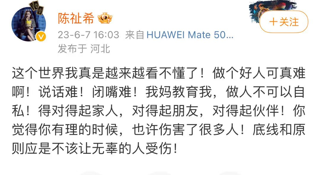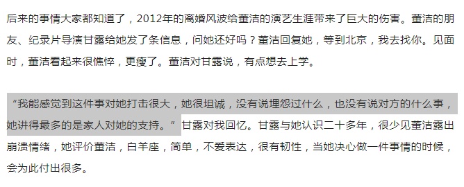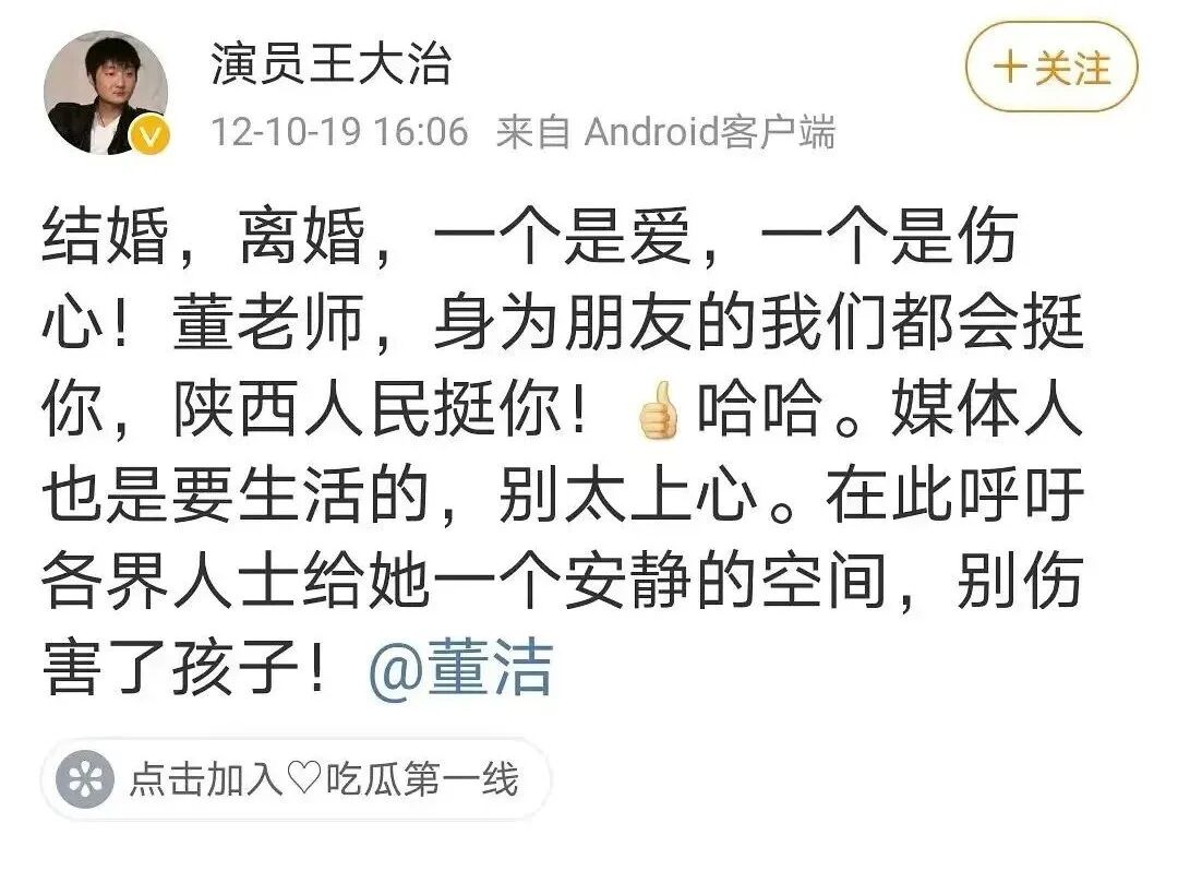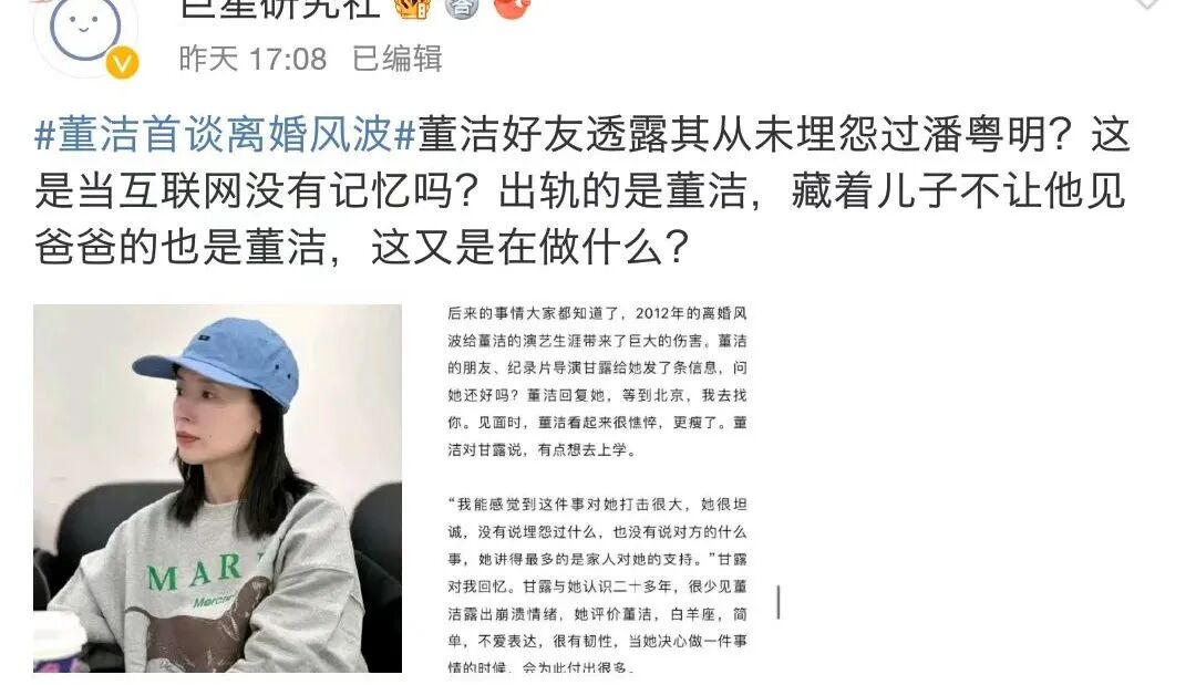 “我从未说过潘粤明的坏话”:12年后董洁首谈离婚风波,评论区却翻车了… 正经婶儿 内地男星 2023-06-08 16:20:13 331 创作不易,用心坚持,欢迎请BaGua喝几杯爱心咖啡!打赏并支持本文 打赏并删除本文 没想到时隔12年,还能再次等来董洁和潘粤明的后续。热搜上,董洁首次回应了和潘粤明的离婚风波。其实我记得2018年董洁接受《人物》的采访,就提到过离婚的事。但热搜说首次就是首次吧。董洁的原话是,“自己”的生活并不需要向大众交待,但这些年大家总是在用自己的角度评价“自己”。“我真的需要从我的角度,告诉大家我是谁。”“我从未说过对方一句。”董洁说自己一个特别幸运的人。2000年春晚,作为替补舞蹈演员,幸运地登上春晚的舞台。接着接到了张艺谋导演的《幸福时光》的选角通知。再然后是《金粉世家》的冷清秋。很少主动去争取角色,却总能顺风顺水,总有光环伴随左右。直到遇见,潘粤明。“那十年很凌乱,除了家人之外,什么都一下子散了。”婚变之后,董洁变得憔悴,更瘦了。无法争取到角色,只能演妈妈,演恶女。灰心的时候,董洁打算逃离这一切。但现实摆在眼前,自己逃了,父母和儿子怎么办?董洁放不下亲人,于是她带着儿子搬回了老家,每天早上5点50起床,给家人做饭,送儿子上学,陪儿子学网球。在家人的陪伴下终于走过了阴暗的日子。至于潘粤明,认识董洁20多年的朋友说:“她很坦诚,没有说埋怨过什么,也没有说对方的什么事,她讲得最多的是家人对她的支持。”这位朋友还评价董洁,白羊座,简单,不爱表达,很有韧性,当她决心做一件事情的时候,会为此付出很多。从董洁的讲述,确实看到了一只“韧性的白羊”在10年里的浮沉。但是其他事,就不太好说了,还是看新闻。2008年9月26日,董洁和潘粤明举办了婚礼。婚后,潘粤明给儿子取名“顶顶”,因为那时候“幸福已经到了顶点”。结果,遇到了王大治。这张照片是2013年卓伟公开的。而2012年,董洁和潘粤明就已经离了婚。王大治还发了微博声援董洁。离婚的原因,董洁工作室在声明中写的是:潘粤明家暴、嗜赌、性无能。赌场的照片确实潘粤明被拍到了,但也只是一张照片。后来潘粤明把董洁经纪人任佳莹告上了法庭,最终名誉案胜诉。只是离婚案他却输的一败涂地。趁着潘粤明在外拍戏,董洁带走孩子搬空了家。后来,潘粤明父亲因突发高血压被送到医院抢救,他鼓起勇气联系董洁。结果父亲还是没能见到孙子。外界传闻,董洁回复说:我没这个义务。当然,传闻是传闻,明面上董洁好像并没有说过不让孩子见父亲。2018年董洁接受《人物》采访,她有个朋友是这么讲述的:说她不让对方看孩子,我跟她从第一天开始起,我俩就在一起,我以人格担保她从没有。后来这位朋友还把这段话发在了微博上。但潘粤明也确实整整9年都没见儿子,只能在网上留言。再后来董洁带着顶顶录制综艺时,被问到顶顶和爸爸的感情,董洁说:我们都要接受现实,我也要接受、顶顶也要接受,谁也没有办法改变命运。那期节目播出后,潘粤明发微博质问董洁:真要面对现实,敢不敢把真相讲出来?那么,真相是我们看到的那样,还是董洁今天讲述的这样?不过我觉得都不重要,重要的是,事情早就过去了。风波后,董洁就换了新的经纪公司,新公司都没有去压热搜,自然而然,热搜就成了咪蒙和刘强东。再之后,董洁上了综艺,前几年在《如懿传》中饰演富察皇后。最近又跑去做了直播,口碑还挺可以的,听说赚了好几个亿。潘粤明这边在风波后也振作起来了。《唐人街探案》里的杀人犯,电视剧《白夜追凶》,还有盗墓系列。也依旧相信爱情,“相信爱情,为什么不相信?就跟你感冒以后,还会相信自己的身体一样。”他也有一个女朋友,就是《白夜追凶》的女演员尹姝贻。2019年两人传出恋情,虽然一直没有承认,但是也一直被拍到。另一位主角王大治,和董洁产生关系时是有家庭的。后来离了婚,在2018年又结了婚,开始了新的生活。也依然在娱乐圈打拼,拍过一部电影,《我不是王毛》,获得了俄罗斯邦达尔丘克国际电影节影帝。虽然这个电影节是在北京举办的。但是一家人坐在胡同口里吃饭,也很幸福。到了今年年初,顶顶13岁生日,作为父亲的潘粤明又分享了一段视频。然后董洁自己也转发了那条微博。从照片上看,春节董洁发的一张照片里,出现了两个背影。说明潘粤明和儿子已经一起过了个年。网上都说这是世纪大和解,不少人还劝他们就此复婚。复婚不至于,但分道扬镳,各自安好,真的算是回归平静的圆满的结局。而且如果说2023年之前,董洁还是一个毒辣和心机的符号,那和解之后,大众真的放过了她,彻底翻篇。所以,问题就来了,为什么今天要旧事重提呢?在很多人看来,董洁的解释就是掩饰,只有潘粤明才有资格埋怨。也觉得不甘心,还是觉得自己没错,趁着风评好想彻底洗白自己,炒热度。风评变化是事实,潘粤明有没有资格,大家也自有定夺。但我觉得董洁也不像是洗白。刚刚有点起色,她不会傻到去换这种流量。洗不白,也没有什么可需要洗白的,又没有被定性成劣迹艺人。而且事实上,采访里关于潘粤明提到的也就那一句:“她很坦诚,没有说埋怨过什么,也没有说对方的什么事。”还是借朋友之口讲述的一句。所以我觉得,这更像是开解自己,里面有对当年的愧疚和反思,有一路的艰难和委屈。毕竟说了这么多理由,还是心里在