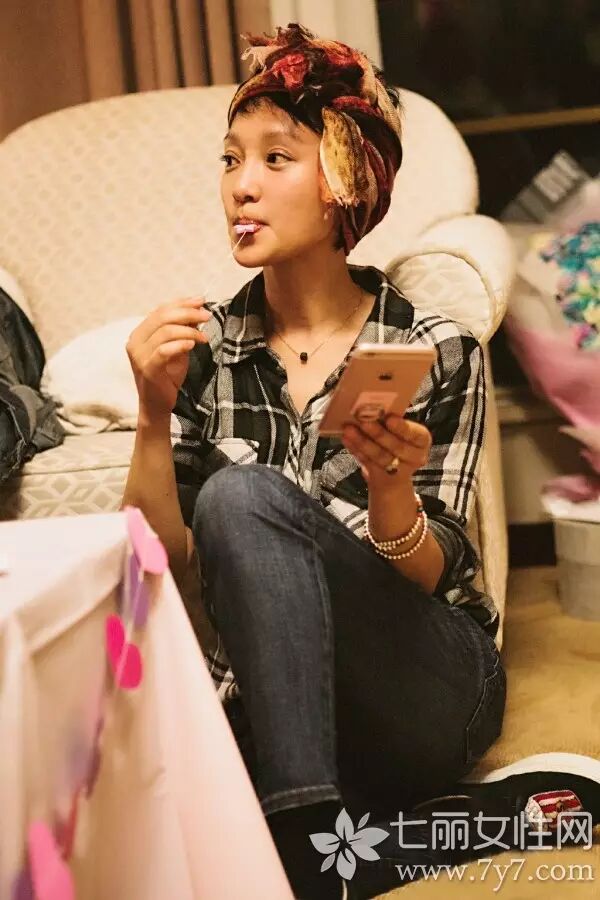 周迅曝出的微博庆生照片,剪了短发后帅气的假小子形象又回来了,格子衬衫配上随意系上的头巾,依旧掩饰不住秀气的面庞。