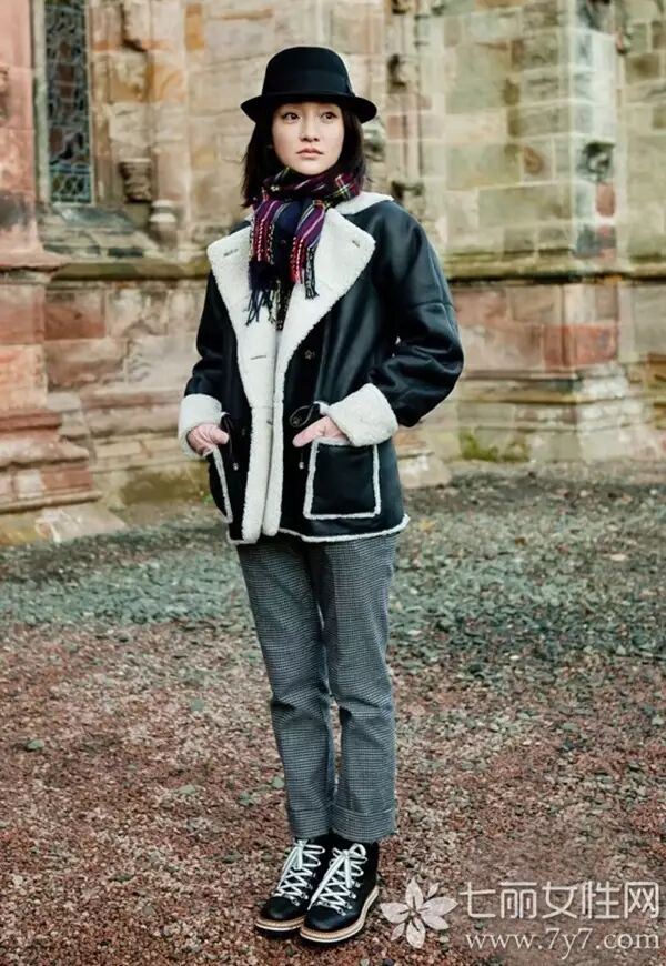 黑色翻毛皮大衣在娇俏身躯的映衬下突显出别样美感,搭配上英伦风的休闲裤,体现出简约都市气息,而彩色编织围巾则成为了彰显个性时尚的符号。