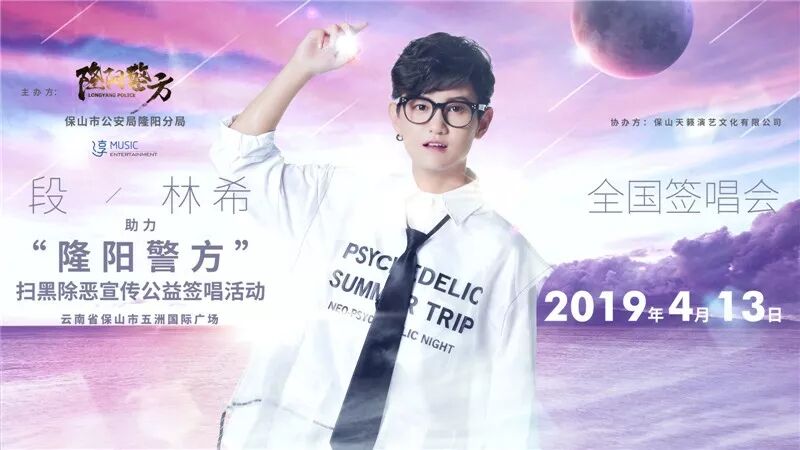 4月13日19时,段林希将助力“隆阳警方”扫黑除恶宣传,在五洲国际广场开展公益签唱活动。