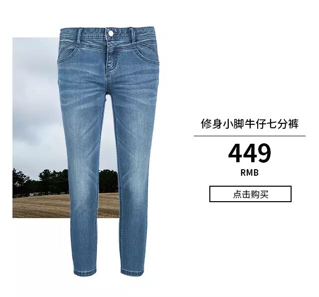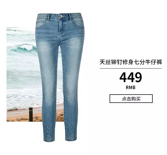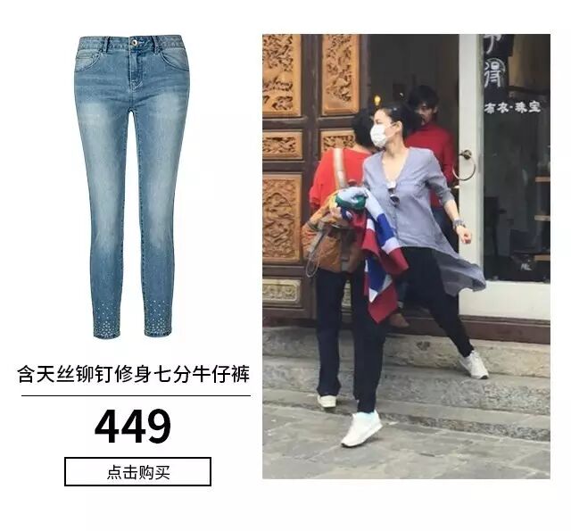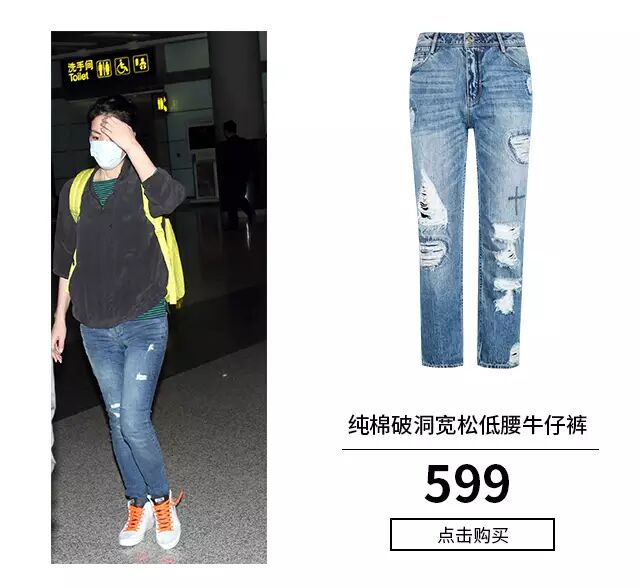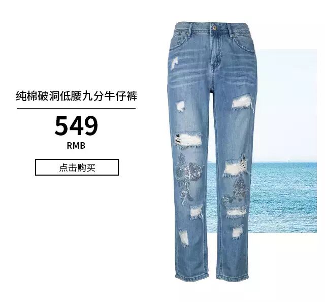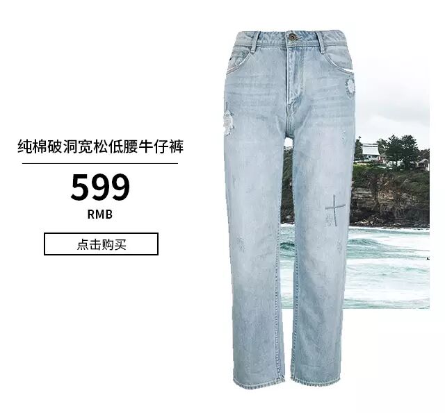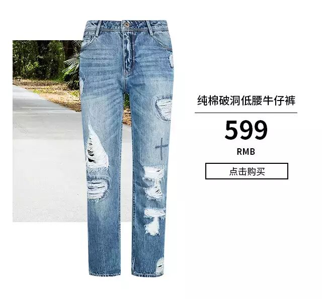 “破洞牛仔裤,天后也爱,居家旅行常备单品,欢迎到ONLY店铺试穿、购买喏。”