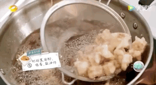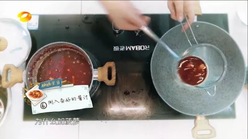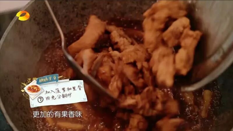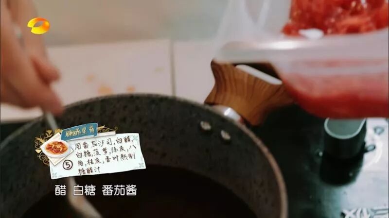 第五步:加用番茄沙司,白醋,白糖,菠萝,陈皮,八角,桂皮、香叶熬制糖醋汁