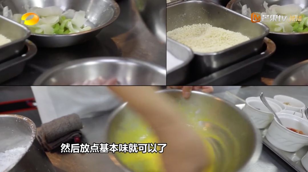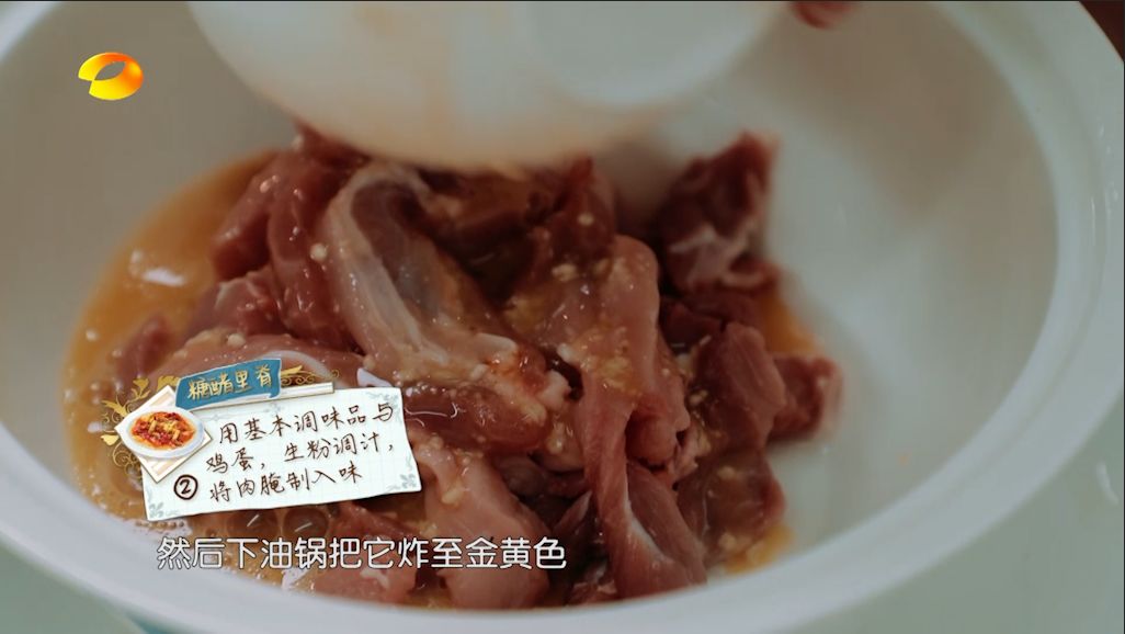 第二步:用基本调味品与鸡蛋,生粉调汁,将肉腌制入味
