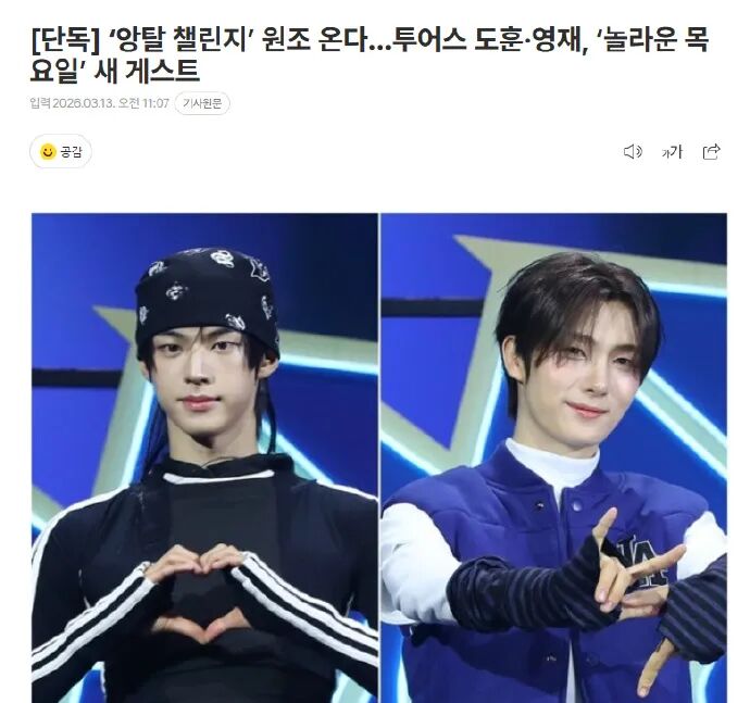 13日据独家报道,TWS金道勋、崔英宰最近作为嘉宾参加了tvN新综艺节目《惊人的星期四》的录制。
