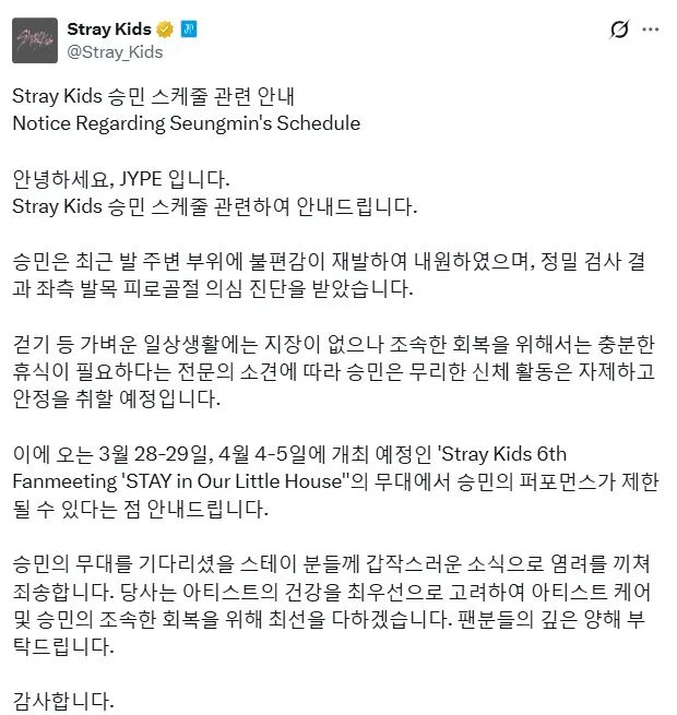 虽然在行走等轻度日常生活方面没有明显困难,但根据专科医生的意见,为了尽快恢复,需要充分休息。因此昇玟今后将避免过度的身体活动,以休养和恢复为主。因此,在3月28–29日、4月4–5日举办的Stray Kids 6th Fanmeeting ‘STAY in Our Little House’活动舞台上,昇玟的表演(舞蹈/舞台活动)可能会受到限制,特此说明。