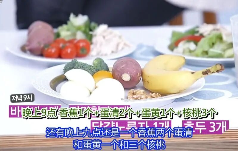 晚上9点:2个蛋白+1个蛋黄+1根香蕉+3个核桃;