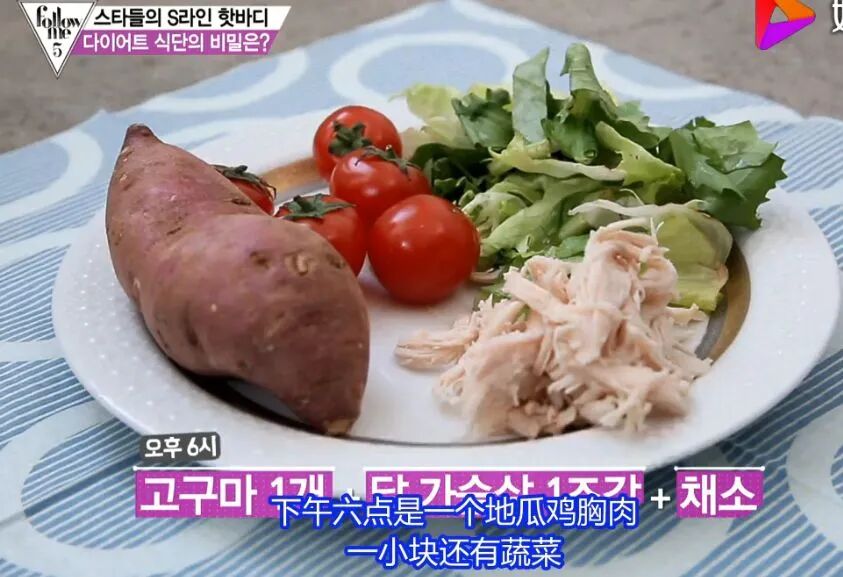 下午6点:1块鸡胸肉+1个红薯+蔬菜水果;