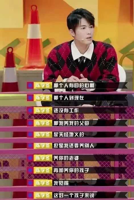 陈学冬:“那个人有目的心啊,那个人到现在还没有工作,那我养我的父母是天经地义的,我还要养别人,养你的老婆,再加养你的孩子,我想这对于孩子来说是不公平的吧。”仔细想想这句话虽看似任性却还是很有道理的。