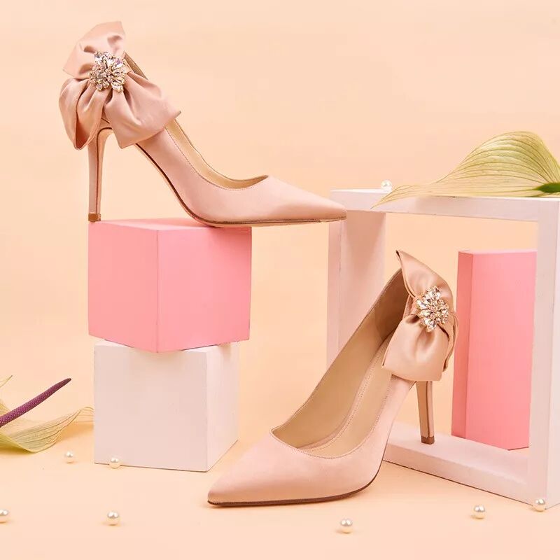 淡粉色缎面透着朦胧的柔和与甜美,在皇冠形珠宝钻饰的点缀下,愈发奢华精美,闪耀华丽,让你在婚礼、party、晚宴等场合,都可以尽情演绎浪漫宫廷风。