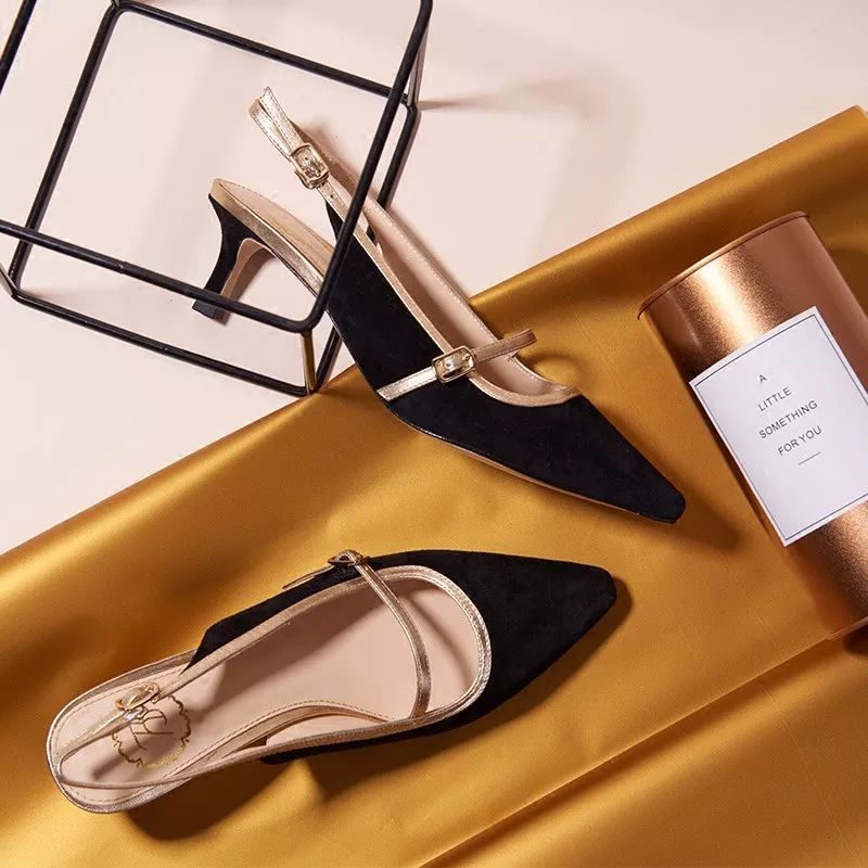 万年不过时的经典鞋款,越复古越时髦,优雅的黑色麂皮Slingback,采用vintage款小尖方头设计,搭配浅金色镶边和金属方扣,散发浓郁复古腔调。