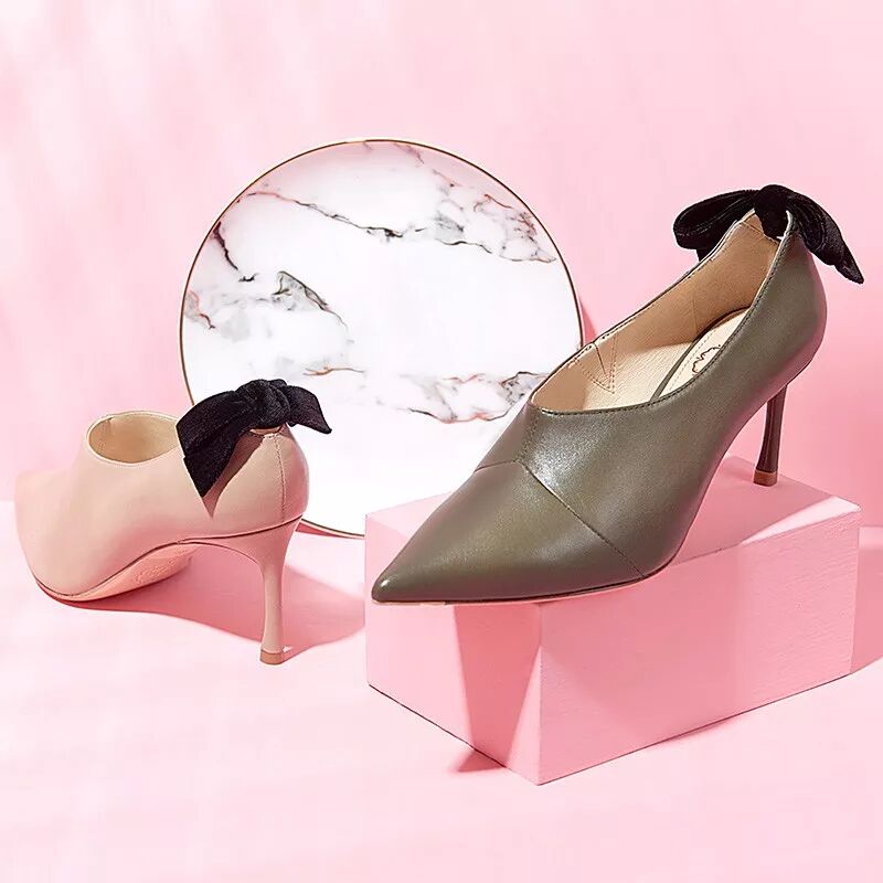 深口设计搭配尖头细高跟,新潮前卫又显高显瘦,小巧的丝绒蝴蝶结轻盈点缀,甜美粉和军绿配色,打造优雅复古学院风。