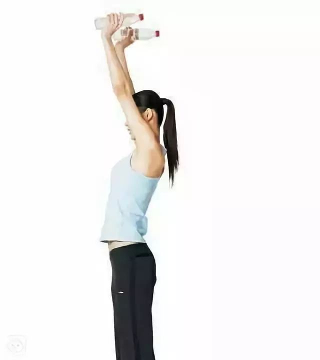 双手握住矿泉水瓶,向上推举,手臂伸直后慢慢向下放,直到肘关节与肩关节平行为止,再向上推举。