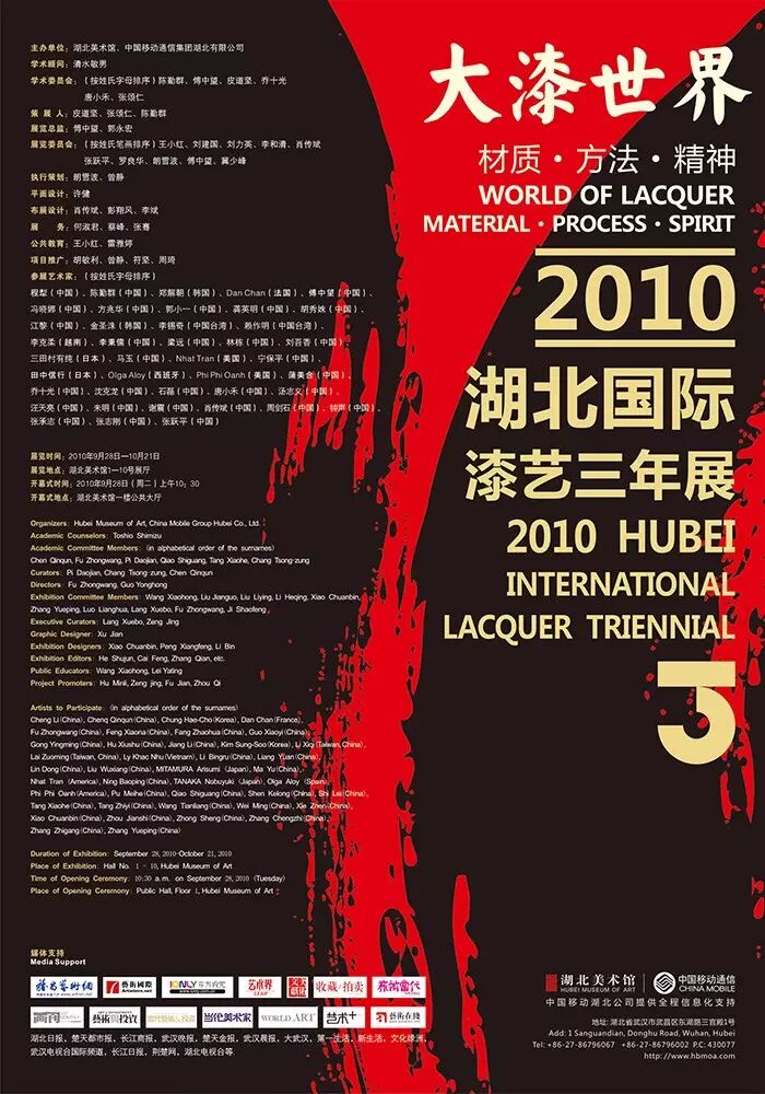 举办了两届的“湖北国际漆艺三年展”可以说,已经成为了湖北的文化名片之一。“湖北国际漆艺三年展”是湖北美术馆于2010年打造的,以张颂仁、皮道坚、陈勤群为核心学术主力推动,以期在拥有深厚漆艺传统的湖北,借助当代艺术的形式、国际的交流平台,唤起人们对东方文化中传统的漆艺的记忆,重新认识这门独特技艺,复兴中华漆艺,并让其能重回到人们的日常生活,也能使新漆艺走向更广阔的国际艺术舞台。第一届的三年展以“大漆世界—材质•方法•精神”为主题,所展出的作品分为漆空间、漆造物、漆平面等,所用材料均为天然大漆。,凝聚了日本、韩国、美国、法国、西班牙、越南、中国及中国台湾的41位优秀漆艺家的作品,让国内观众集中地看到了不同国家、不同文化背景下的当代漆艺艺术家如何坚守大漆工艺的创作,这些作品延续了东方漆艺“器以载道”的传统文脉,也呈现出传统漆艺向当代转型的多种可能性。