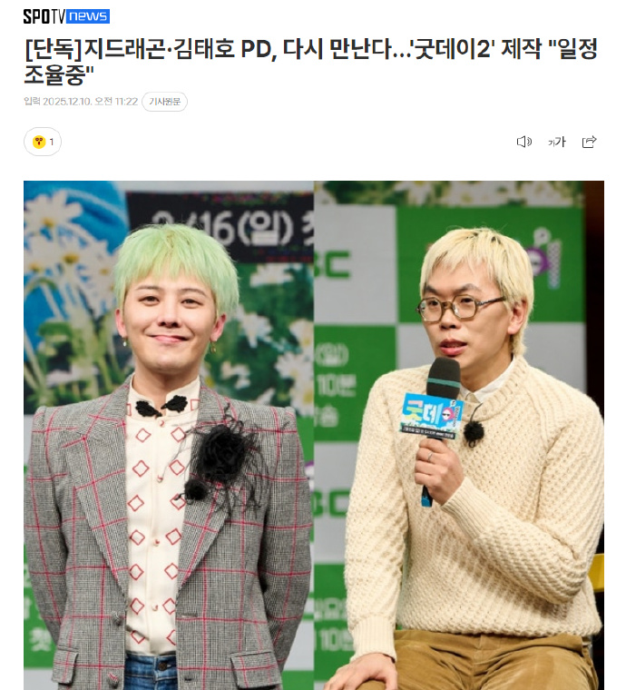 权志龙 x 金泰浩PD将制作《Good Day 2》,日程调整中