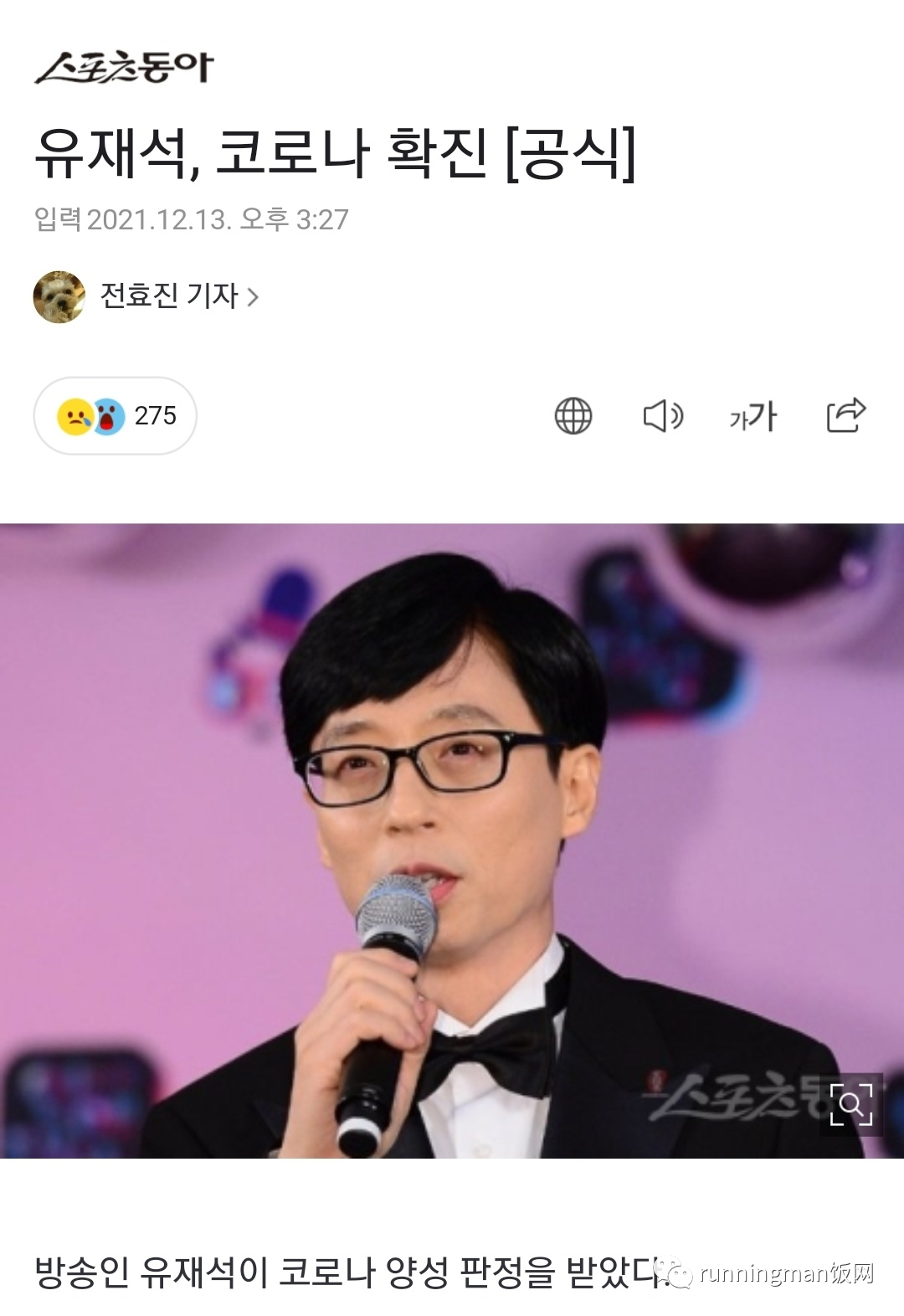 刘在石在9月已经完成2针疫苗接种,11日接到新冠确诊者的密接通报便进行了第一次PCR检查,结果为阴性,被划分为被动监视者。之后根据防疫政策在今天(13日)进行了第二次PCR检查,检查结果为确诊新冠。