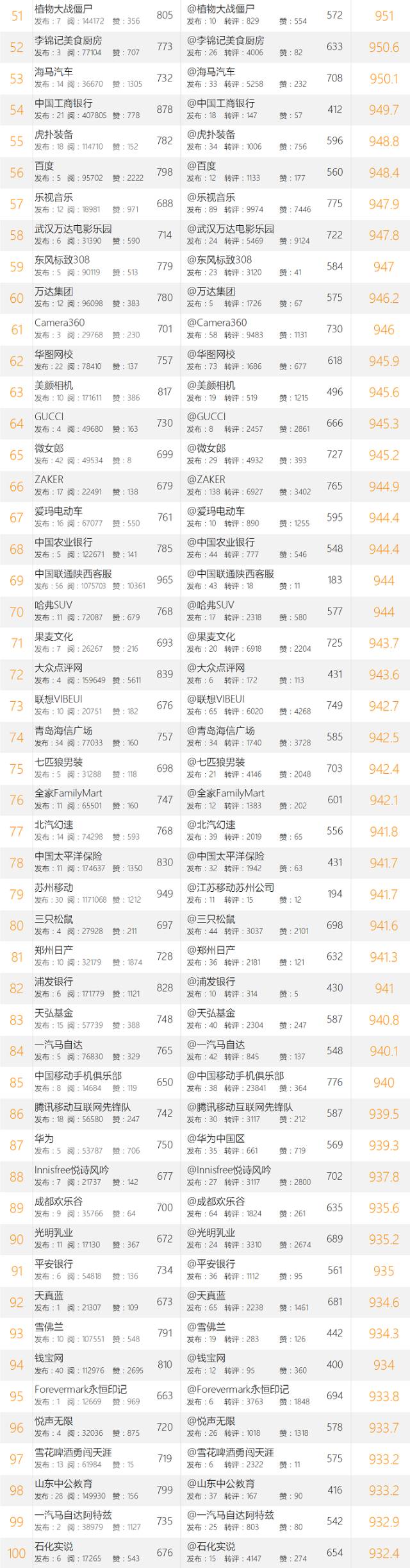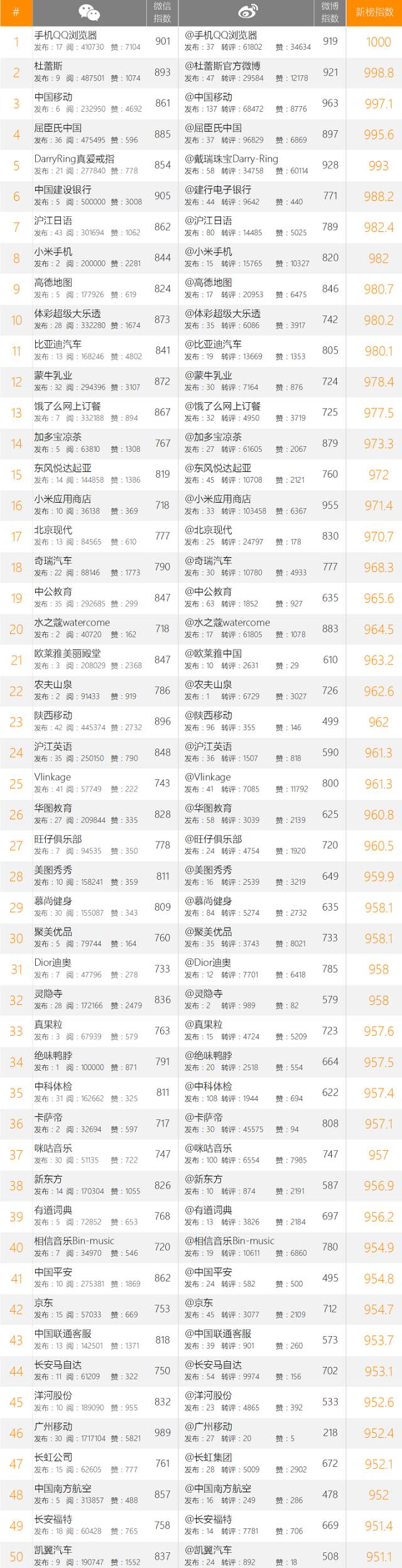 “手机QQ浏览器”不出所料,从上周第20位一跃夺得本周冠军,新代言人李易峰的小鲜肉效应势不可挡,无论是总阅读数还是点赞数,都一路飙升;“杜蕾斯”只能屈居第二;“中国移动”本周来到三甲行列。 本周黑马落户“中国建设银行”,微信方面表现亮眼,发布五次收获50w+阅读;“沪江英语”也来到十强。“小米手机”替换“小米公司”继续霸占第八。