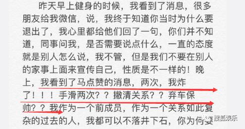 首先,他质疑了马雪阳的点赞行为,认为自己一个被退团的人都可以不落井下石,马雪阳这种行为就是为了“撇清关系”。