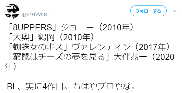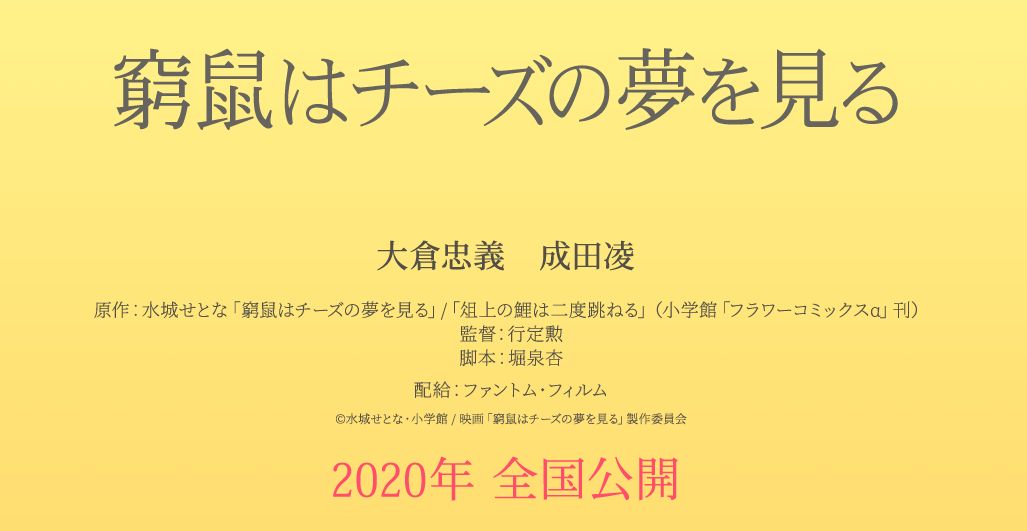 人气组合关八成员大仓忠义(33岁)和演员成田凌(26岁)将首次共演电影《穷鼠梦见奶酪》(公映日未定)。本作改编自水城雪可奈漫画作品《穷鼠梦见奶酪》/《俎上鲤鱼的二次跳跃》,原作者曾因《失恋巧克力职人》而被人熟知,该作为大仓忠义单独主演电影。导演由执导《爱,不由自主》、《河畔》的行定勋担任,将大胆纤细地描绘两位男性陷入疯狂热恋的故事。