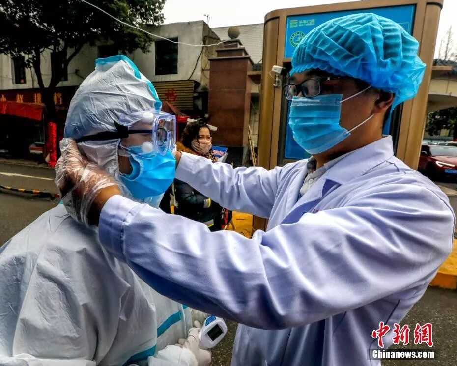 2020年1月28日,安徽省合肥市庐江县中医院新型冠状病毒检测点,护士李凡正在给入院人员做体温检测。庐江县中医院护士李凡和医生杨磊从事医务工作结缘,原定2月1日(正月初八)举办婚礼,婚贴和喜糖早已发送给亲友。面对严峻的新型冠状病毒肺炎疫情,这对情侣果断决定取消婚礼、放弃休息,投身到抗击“肺炎”这场没有硝烟的战斗中。