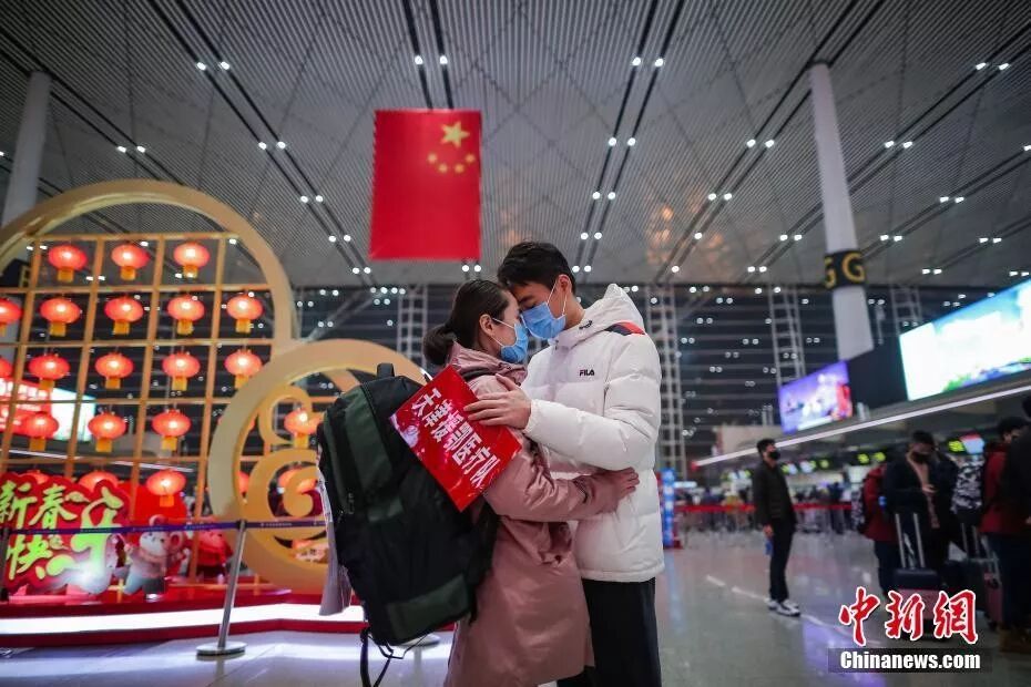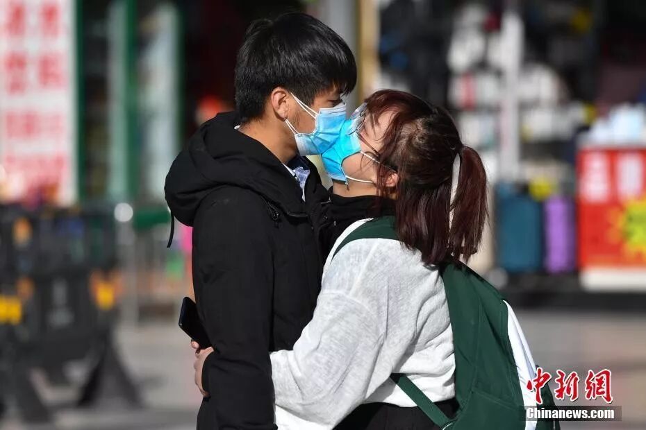 2月11日,昆明火车站广场,戴着口罩吻别的情侣。