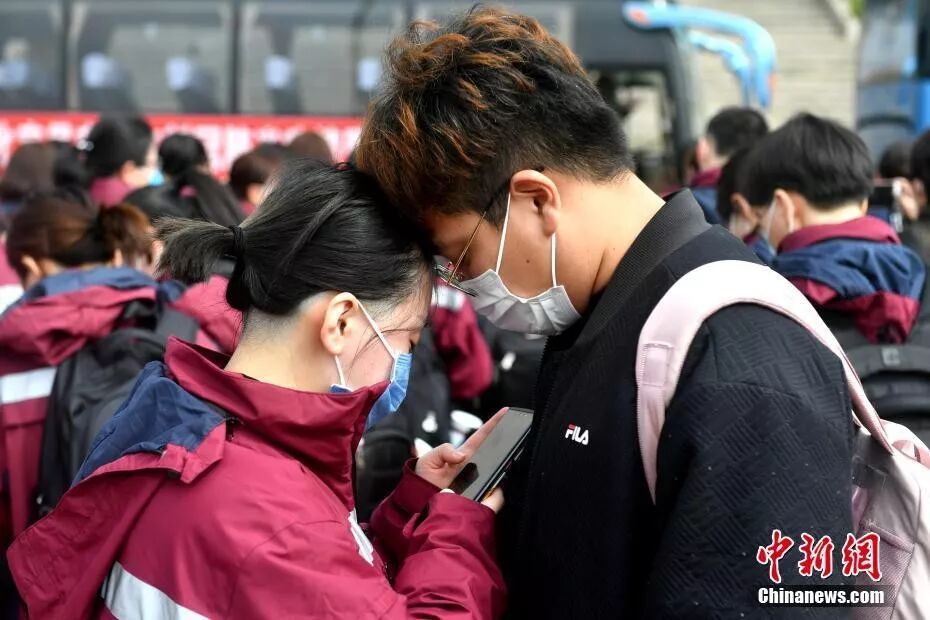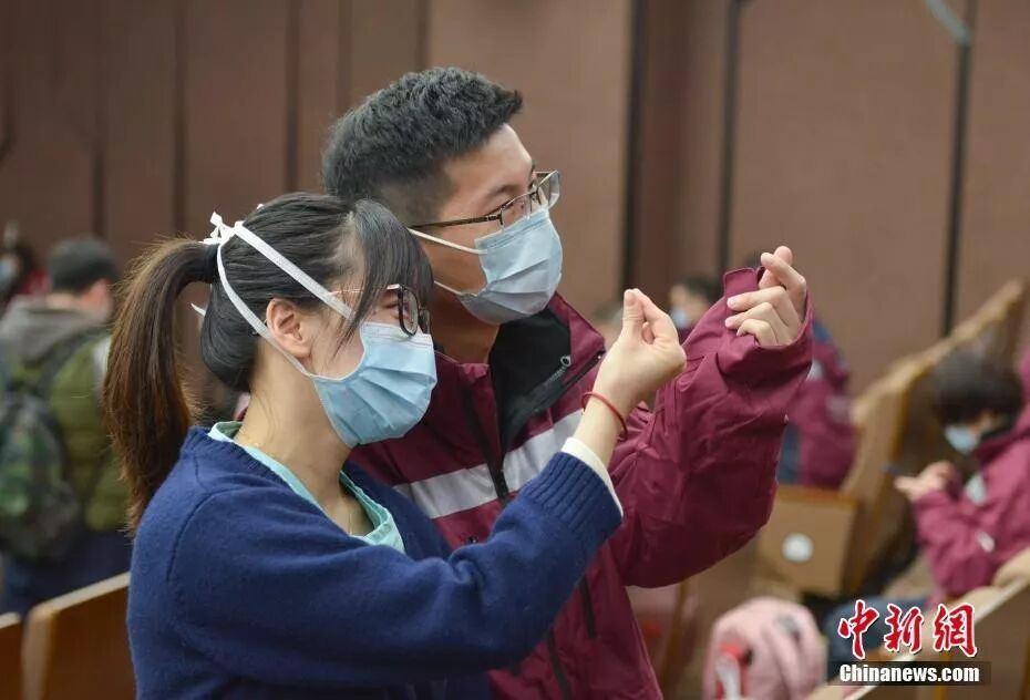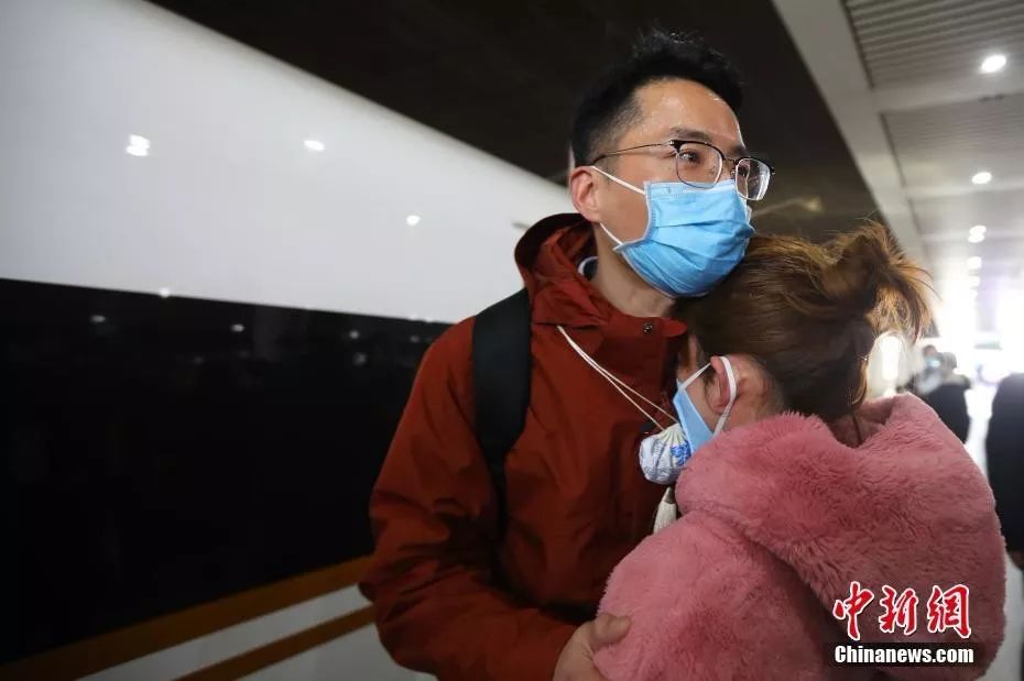 2月10日,由江苏各地中医系统43名医务工作者、江苏省卫生健康委员会派出领队组成的第三支国家中医医疗队(江苏)在南京集结,奔赴湖北省武汉市,协助当地开展医疗救治工作。图为出征的南京市中西医结合医院医生方小谦与他的爱人告别。