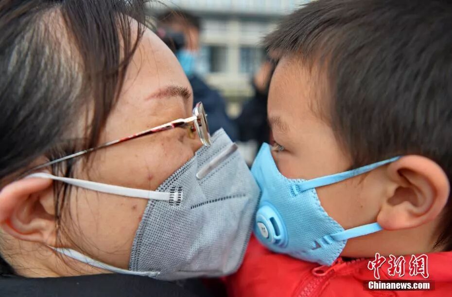 浙江绍兴市中医院呼吸科医生王一萍5岁的儿子七七(小名)为母亲送行。2月5日,王一萍随绍兴市第三批驰援武汉医疗队出发。