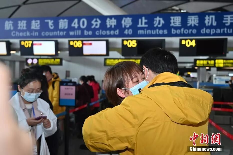 2月12日,重症医学科护士赵建华(右)与前来送机的妻子惜别。当日,云南省对口支援湖北省咸宁市医疗队第一批350余名成员从昆明市乘机启程,支援当地新冠肺炎疫情防控和救治工作。