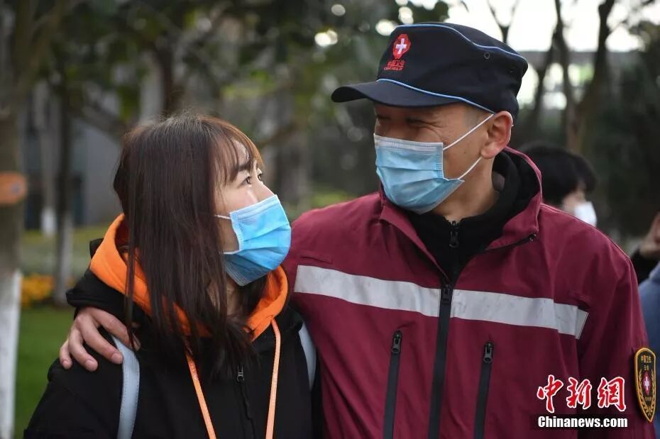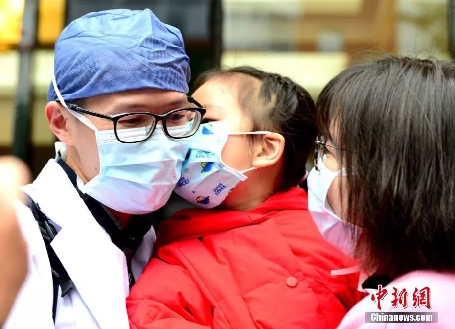 2月13日,福建医科大学附属协和医院选派由39名医师和100名护理人员组成的139人医疗队援助湖北。图为林凯医生(左)的女儿亲吻爸爸。