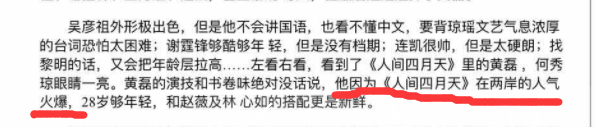 至于他为什么没拿奖,第一,电影而言,当时他演技只能算过关。第二,90年代,港台电影人的天下,不要说黄磊,就是演技再好的内地艺人,也不可能在香港金像奖上拿奖。第三,等内地艺人疯狂在港台拿奖的时候,黄磊已经不拍电影了。最火的《人间四月天》也没拿奖,原因也很简单,它是台湾出品的剧,金鹰节选的是内地剧。