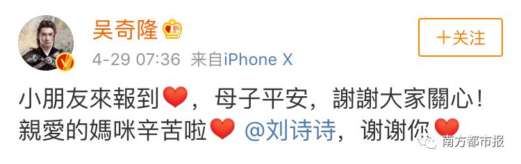 今早7:36,吴奇隆在个人微博公布喜讯,配文宣布:小朋友來報到,母子平安,謝謝大家關心!親愛的媽咪辛苦啦