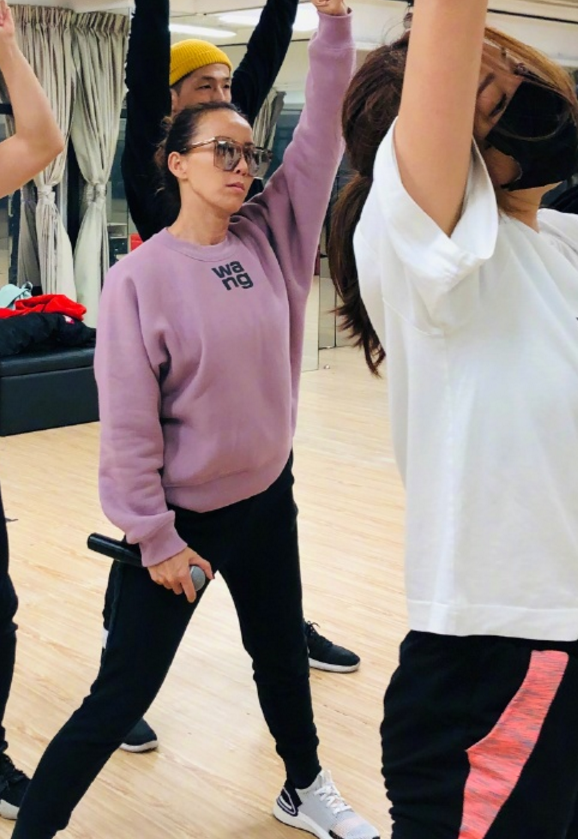 其实她把头发全部固定起来,显得发际线确实会更高一点,而且额头那里也有点油到发亮的地步。但是她上半身穿的是一件卫衣,并且这次她上面穿的卫衣选择的颜色是紫色,这种颜色确实会显得人比较的大气,下面还搭配了一条黑色的裤子。