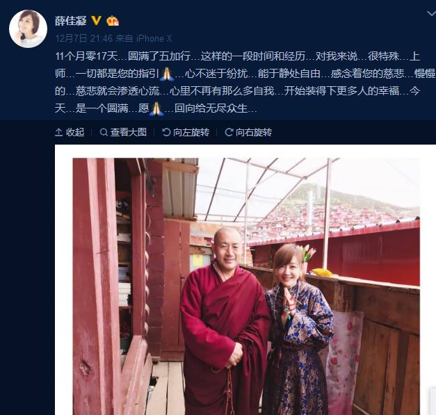 还以为是咋得了,点开才发现是薛佳凝在微博发布自己与佛门上师的合照,自曝已修行11月零17天!