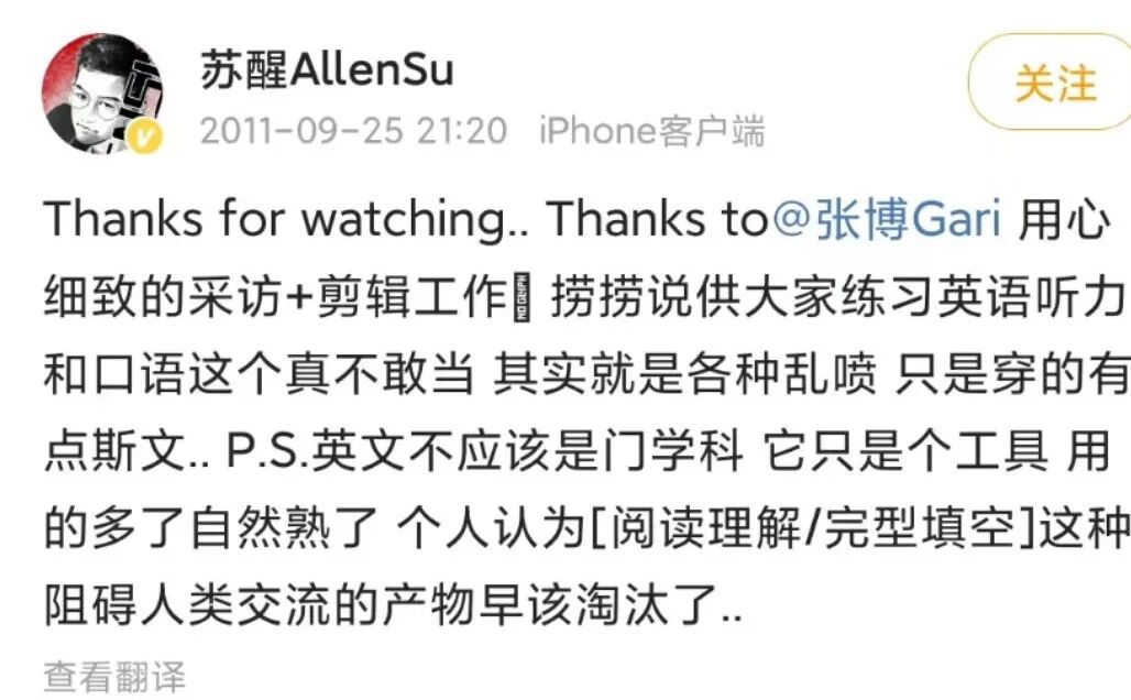 苏醒不止一次说过,英语只是一门沟通工具,大家不妨抱有一种开放的心态去学习,用得多了自然也就熟悉了。