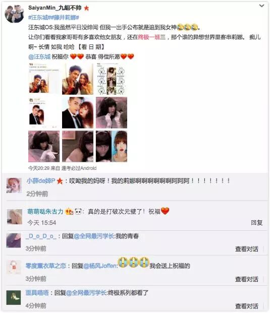 昨日,汪东城在微博发布与日本名模藤井莉娜的亲密照后迅速上热搜,辰亦儒、郭品超等人也纷纷发来了祝福!